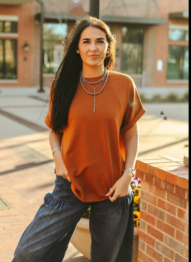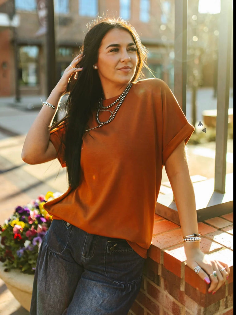 the fabric feels SUPER soft and flowy, the rolled sleeves give it a laid-back but styled look, && the saddle color...are you kidding me?!!