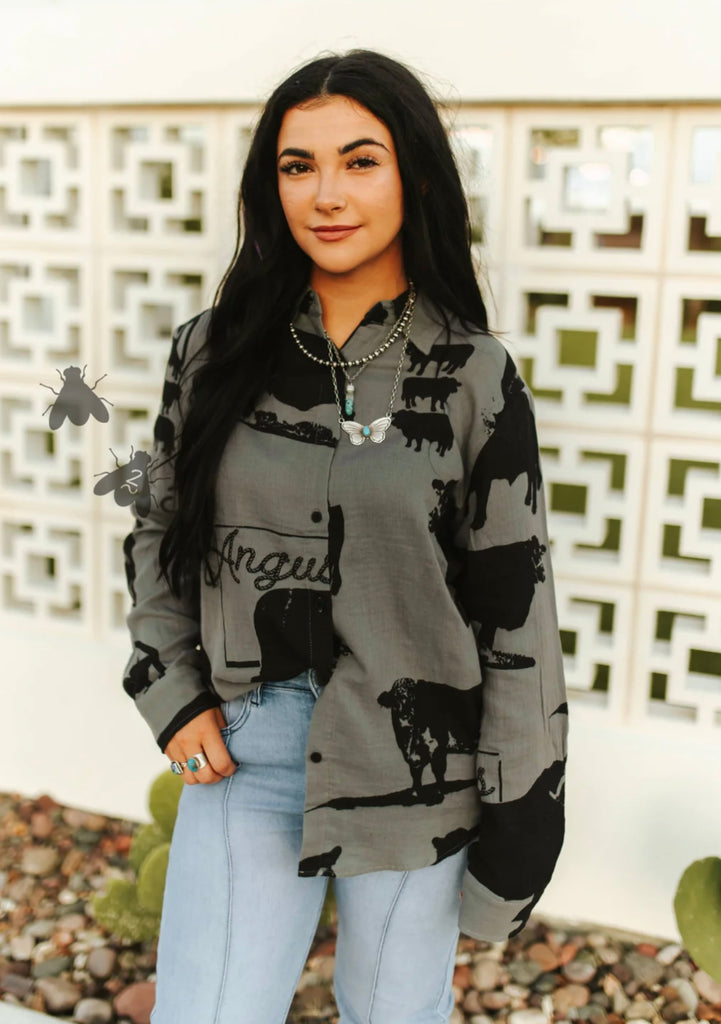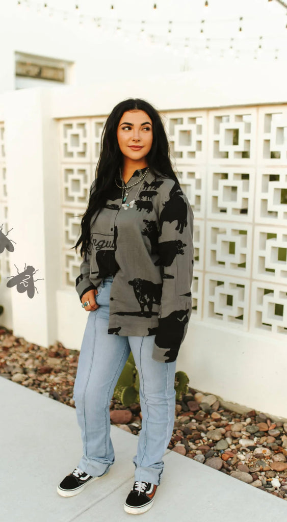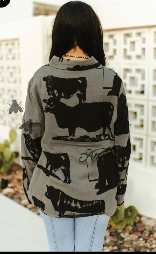 usually i start off with the pattern BUT let me start off with saying HOW AMAZINGLY SOFT AND COMFY THIS MATERIAL is. it's lightweight COTTON and breathable. and PLUS side it's a pattern dedicated to ANGUS cattle. Neutral/Monochromatic vibe. easy one to style